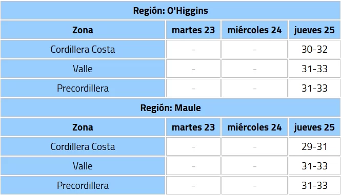 Región del Maule. Las celebraciones navideñas de este año estarán marcadas por un ambiente caluroso en gran parte del país. Según el último reporte de la Dirección Meteorológica de Chile (DMC), la Región del Maule y otras zonas del centro enfrentarán temperaturas que superarán ampliamente los 30°C entre el martes 23 y el jueves 25 de diciembre.